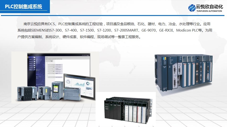 南京云悅欣自動化工程有限公司有從事DCS、PLC控制系統集成的工程經驗,項目可遍及石化。建材。電力、冶金、水處理等行業。應用的系統包括ABB的Frelance2000 、SIMENS-S7-300、400、GE-9070、Modicon PLC等。可為用戶提供方案編制、系統設計、硬件成套、軟件編程、現場調試等一整套工程服務。
